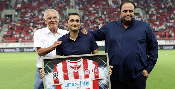 Avant le coup d’envoi du match amical au stade « G. Karaiskakis » contre l’Athletic Bilbao, Vangelis Marinakis a remis à Valverde une plaquette commémorative, ainsi qu’un t-shirt hommage “Légende pour la vie” encadré.