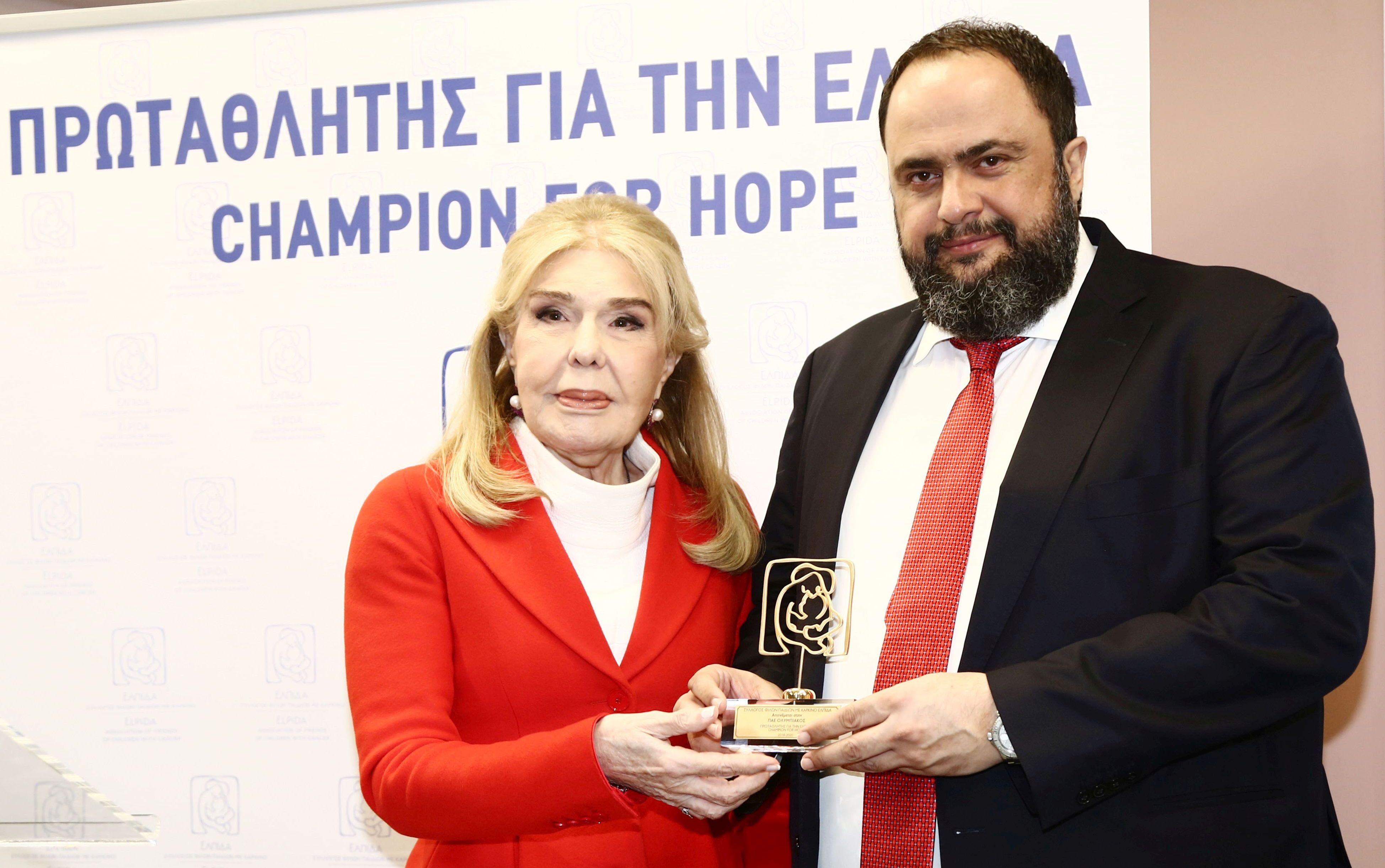 Après la conclusion des interventions, Mme Vardinoyani a remis à l’Olympiacos et à Mr. Marinakis le titre de « Champion de l’ESPOIR » pour 2018-2020 et a souligné que l’Olympiacos serait toujours un champion dans sa participation à « ELPIDA ». Un titre d’honneur et de fierté parmi les nombreux titres qu’a remporté notre équipe, au cours de son histoire, pleine de joie ! Aussi, Mme. Vardinoyani a remis une distinction à Mr. Giannis Moralis, avec lequel elle réalise une étroite collaboration (à travers la Mairie du Pirée), en lui décernant la Statue de l’ESPOIR !