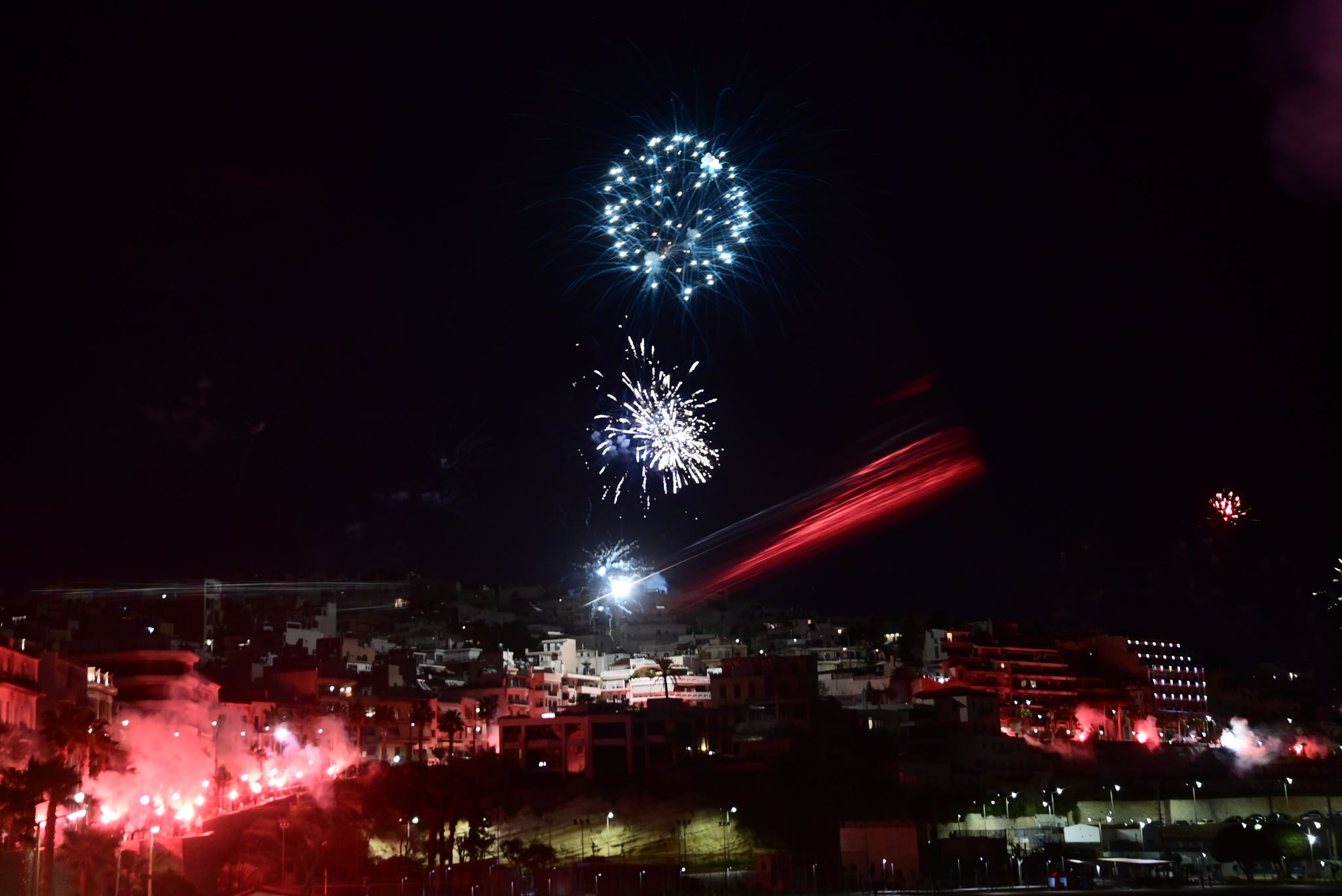 Des fusées de détresse, des feux d’artifice et un spectacle grandiose à la hauteur de la grandeur du club. Un spectacle pyrotechnique à couper le souffle, tandis que la tour du Pirée et le théâtre municipal de la ville étaient illuminés aux couleurs de l’Olympiacos, se joignant ainsi à la célébration du centenaire du club.