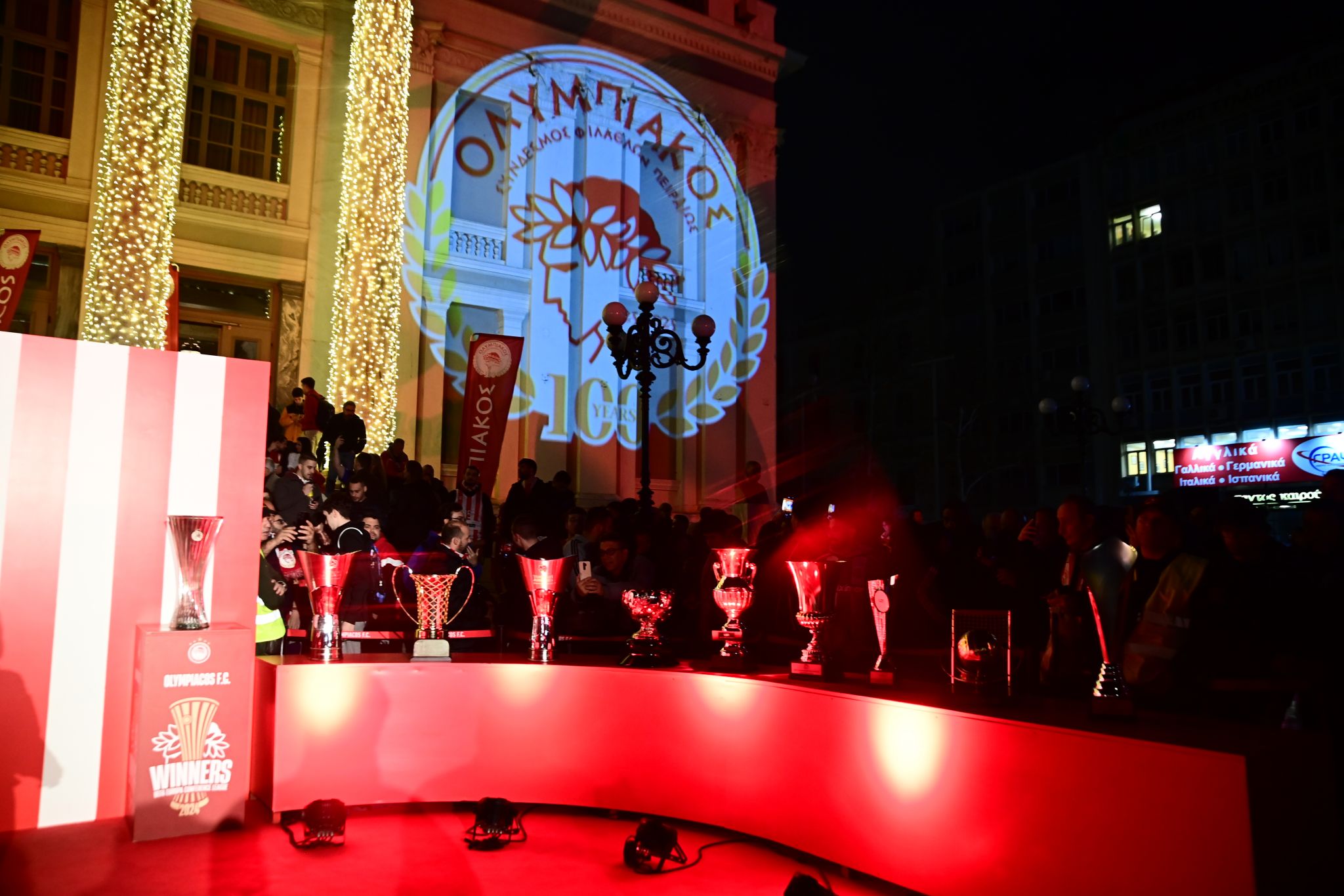 Du lundi après-midi jusque tard dans la nuit, une foule nombreuse s’est rassemblée au théâtre municipal du Pirée pour prendre des photos avec tous les trophées européens de l’Olympiacos et célébrer le centenaire du plus grand club multisports!