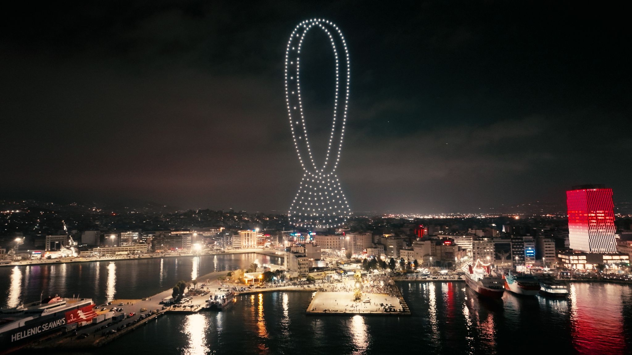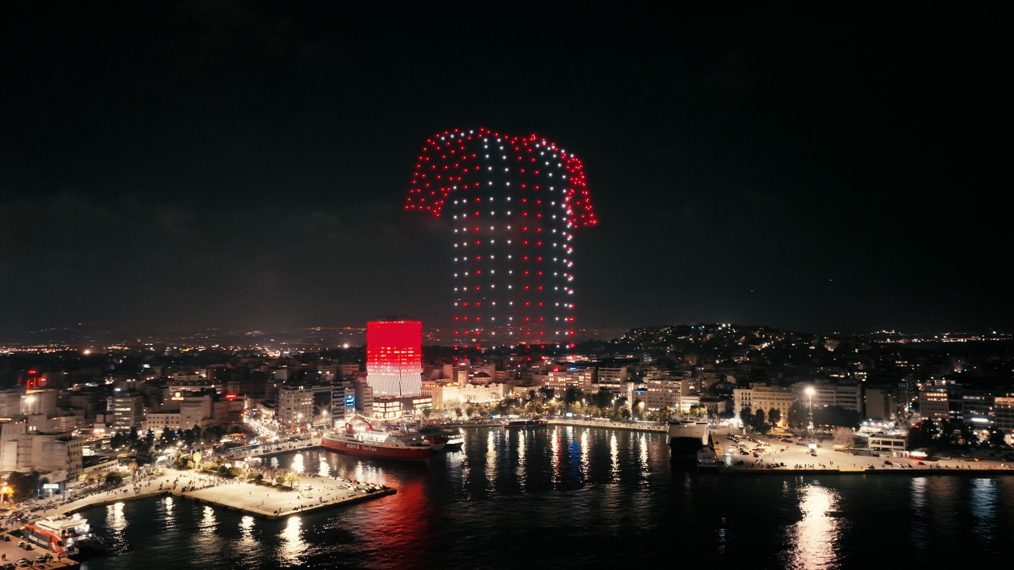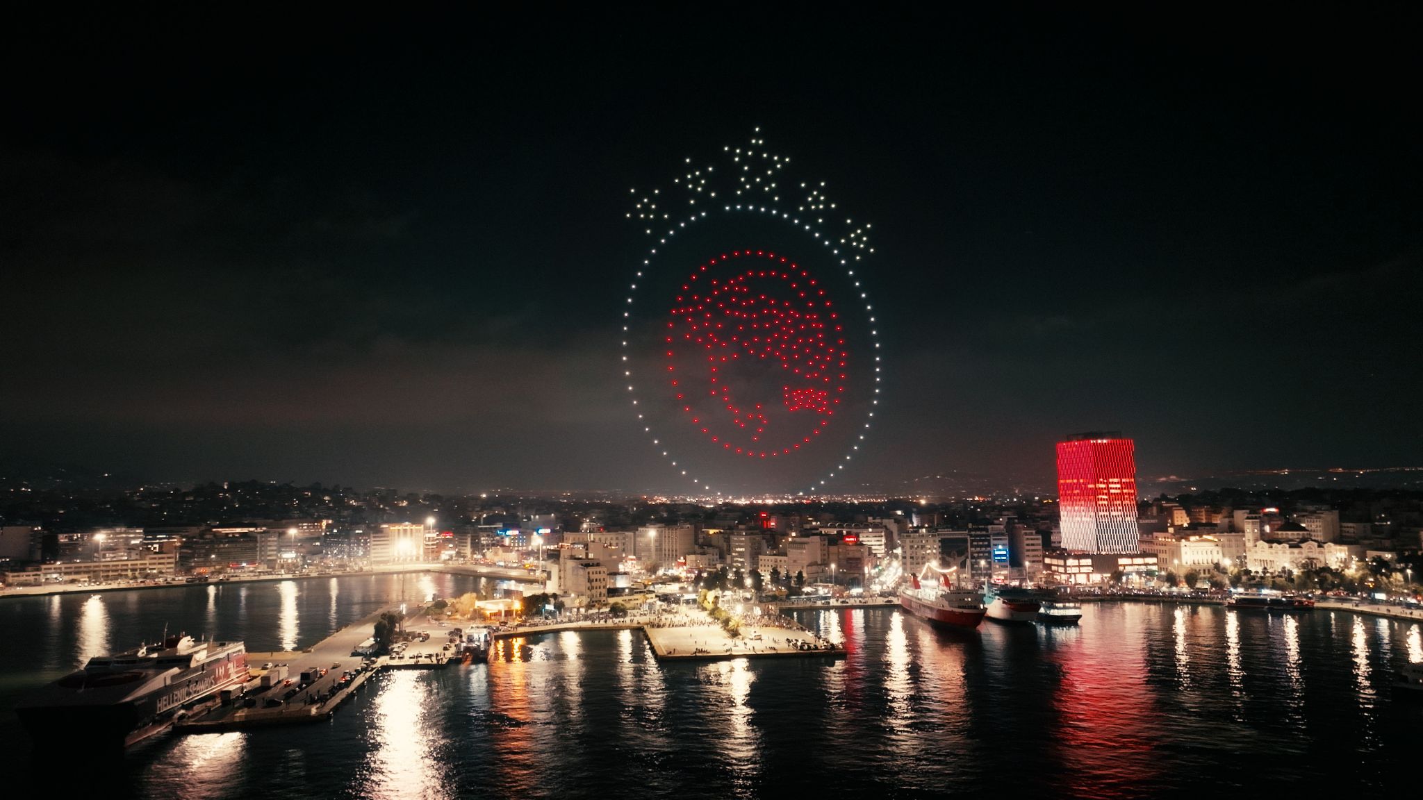 La nuit s’est transformée en jour dans tous les quartiers du grand port grec, tandis que 300 drones ont créé un spectacle rouge et blanc unique en son genre, du jamais vu dans le pays. Les images stupéfiantes ont captivé le public du monde entier, laissant une trace indélébile dans notre histoire.